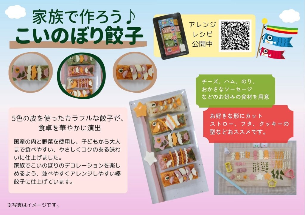 家族でこいのぼりのデコレーションを楽しめるよう、並べやすくアレンジしやすい棒餃子。
